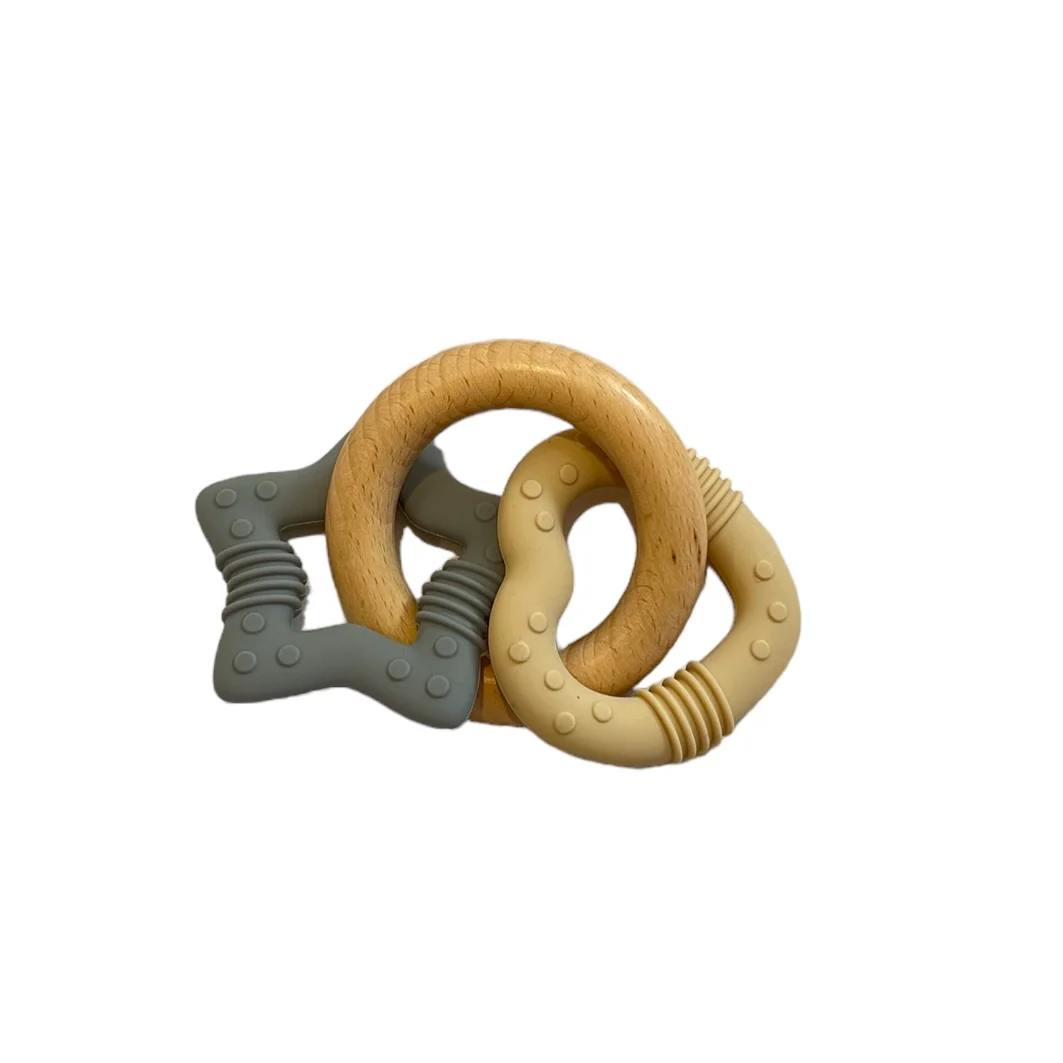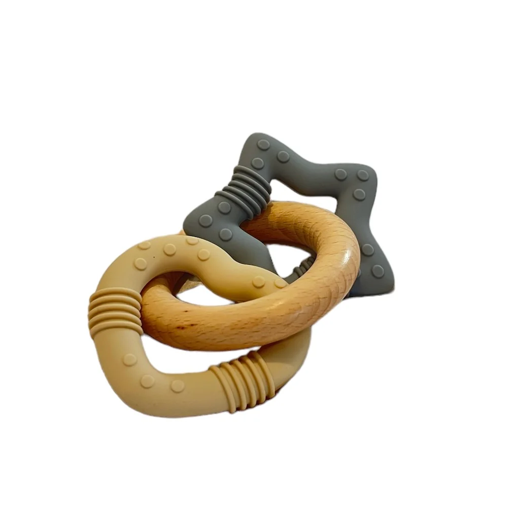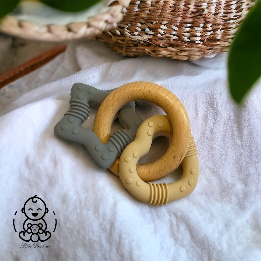 - Matériaux : Un anneau en bois naturel finement poli et deux anneaux en silicone, sans BPA ni substances nocives.