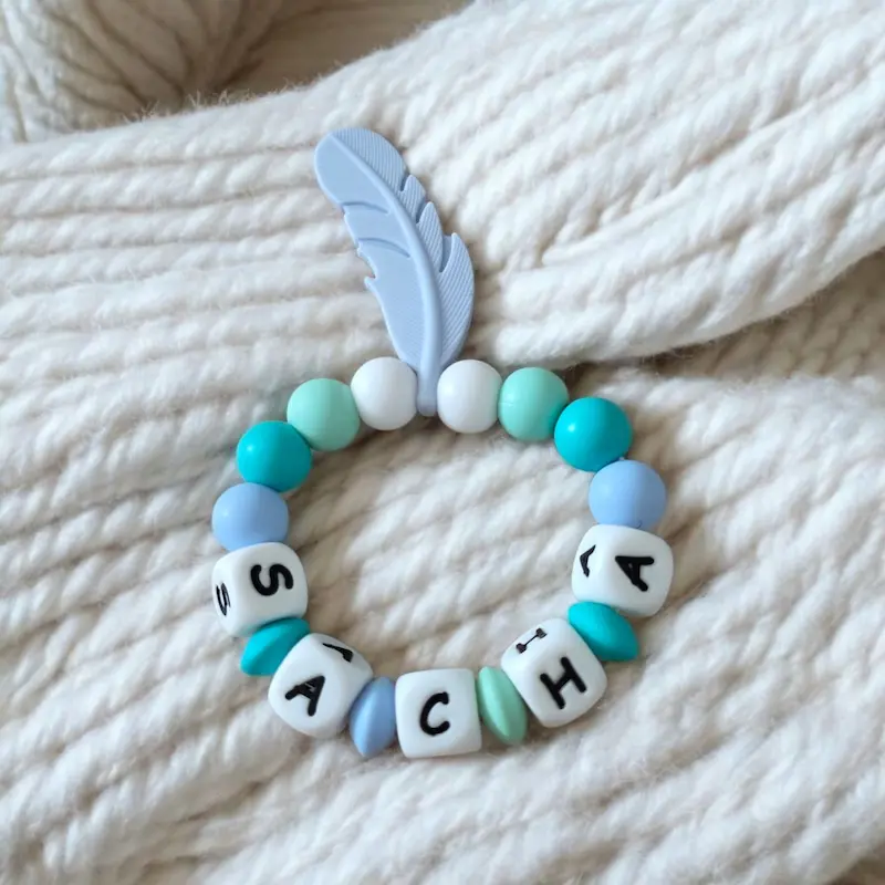 Entièrement fabriqué en silicone alimentaire, sa forme de plume bleue (longueur 6 cm) est parfaitement adaptée aux petites mains pour une préhension facile et sécurisée. La personnalisation avec le prénom en perles alphabétiques en fait un cadeau de naissance mémorable et utile.