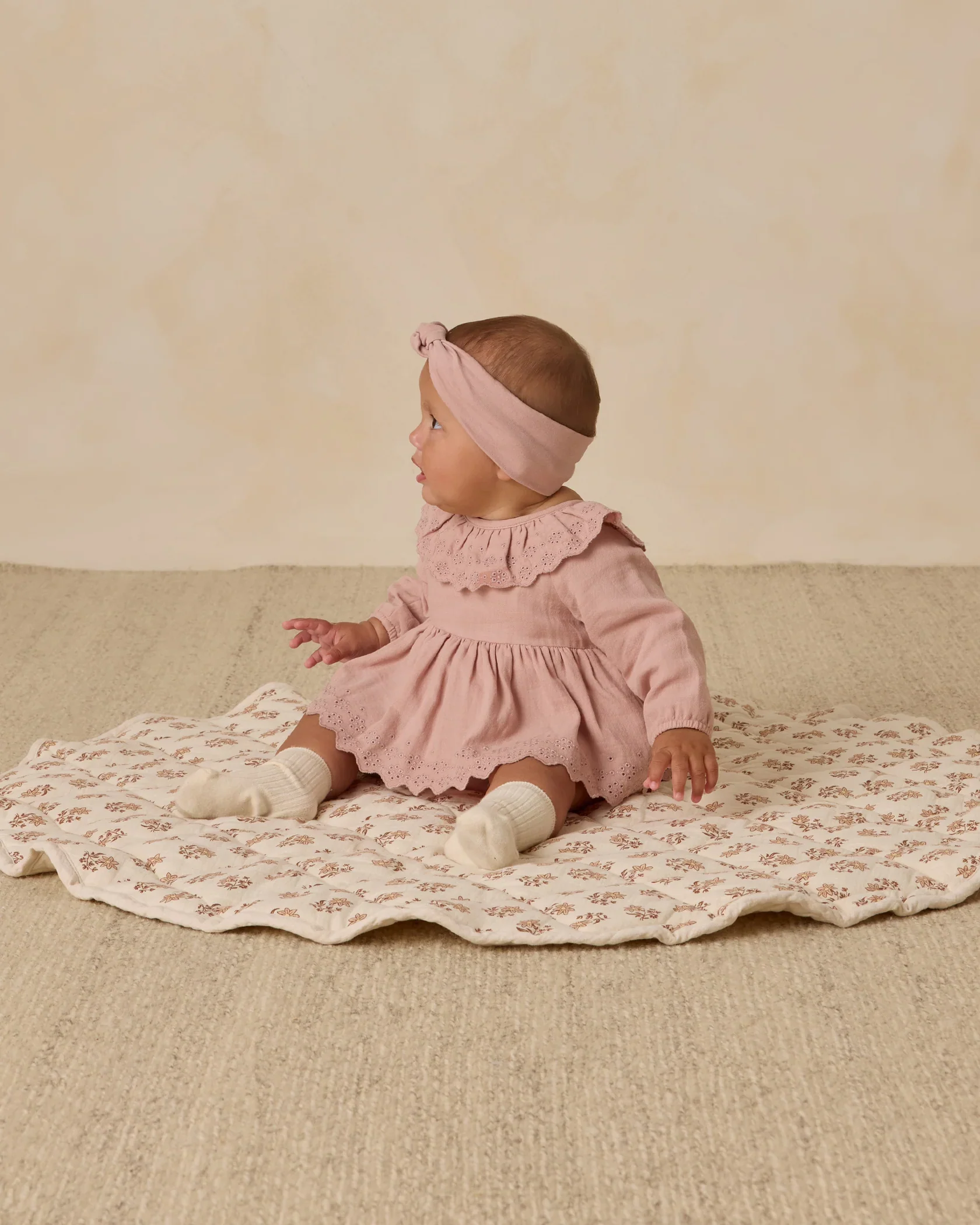 Notre barboteuse Thalia présente un col adorable, des détails brodés, une taille froncée, des boutons en noix de coco au dos et des boutons-pression à l’entrejambe pour faciliter le change.