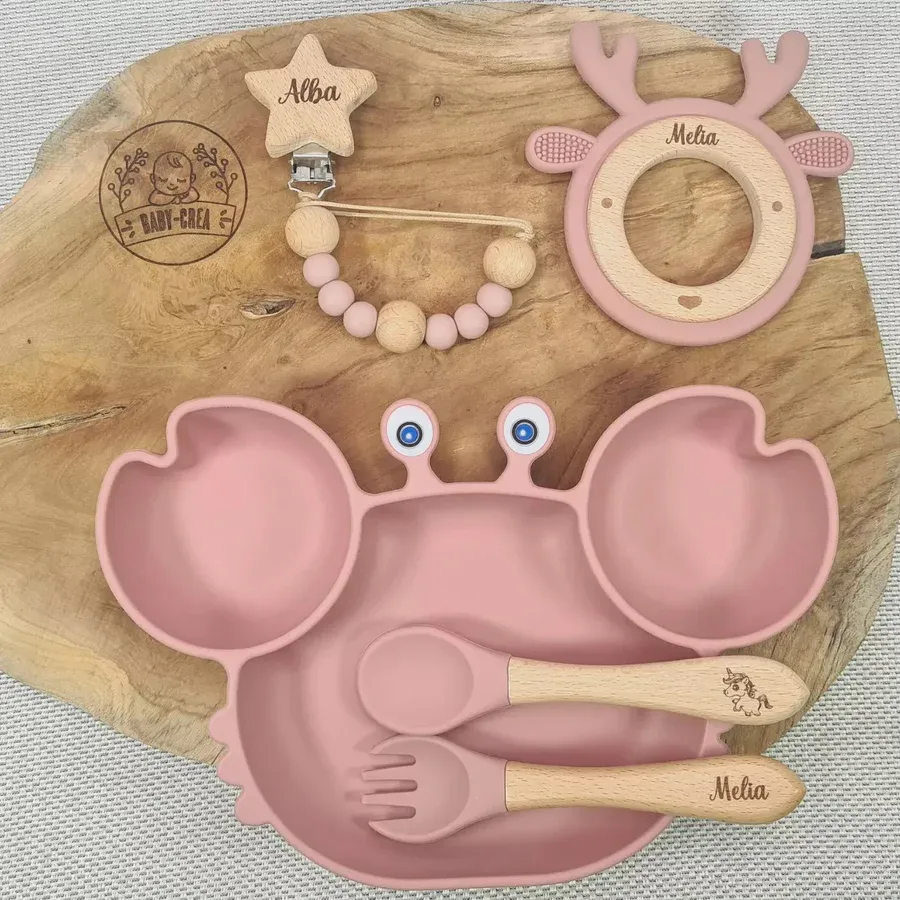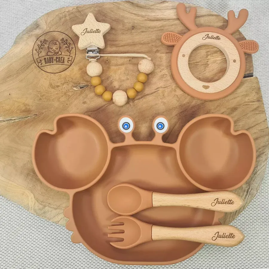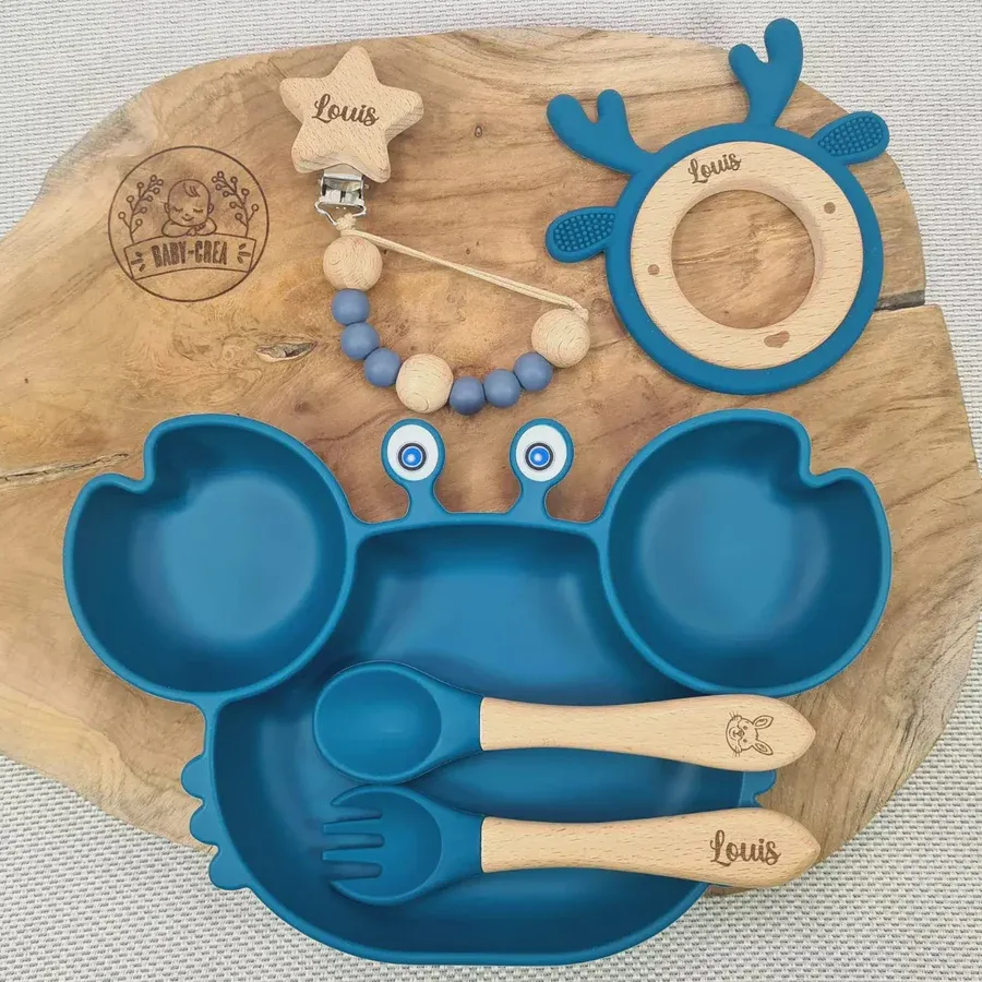 Coffret Bébé Personnalisé – Assiette Crabe, Couverts, Attache & Anneau