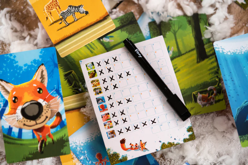 Foxy, c’est l’histoire d’un renard malin qui vous transporte dans un voyage captivant à travers quatre environnements enchanteurs : la mer, la savane, la campagne et la forêt. Tout au long de votre périple, vous ferez la rencontre de divers animaux fascinants, tels que des poissons colorés, des lions majestueux, des vaches paisibles et des écureuils espiègles. Pour gagner, vous devrez affûter votre sens de l’observation et solliciter votre mémoire. Pendant une partie de Foxy, tout le monde joue en même temps, au cours de 20 tours de jeu. À chacun de ces tours on révèle une nouvelle carte (qui viendra à chaque fois recouvrir la précédente) et tout le monde, en simultané, devra : – Observer attentivement le nombre et les types d’animaux présents sur la carte ainsi retournée – Estimer, en fonction de leurs souvenirs, combien d’animaux, du même type que ceux présents sur la carte du tour en cours, sont apparus depuis le début de la partie.